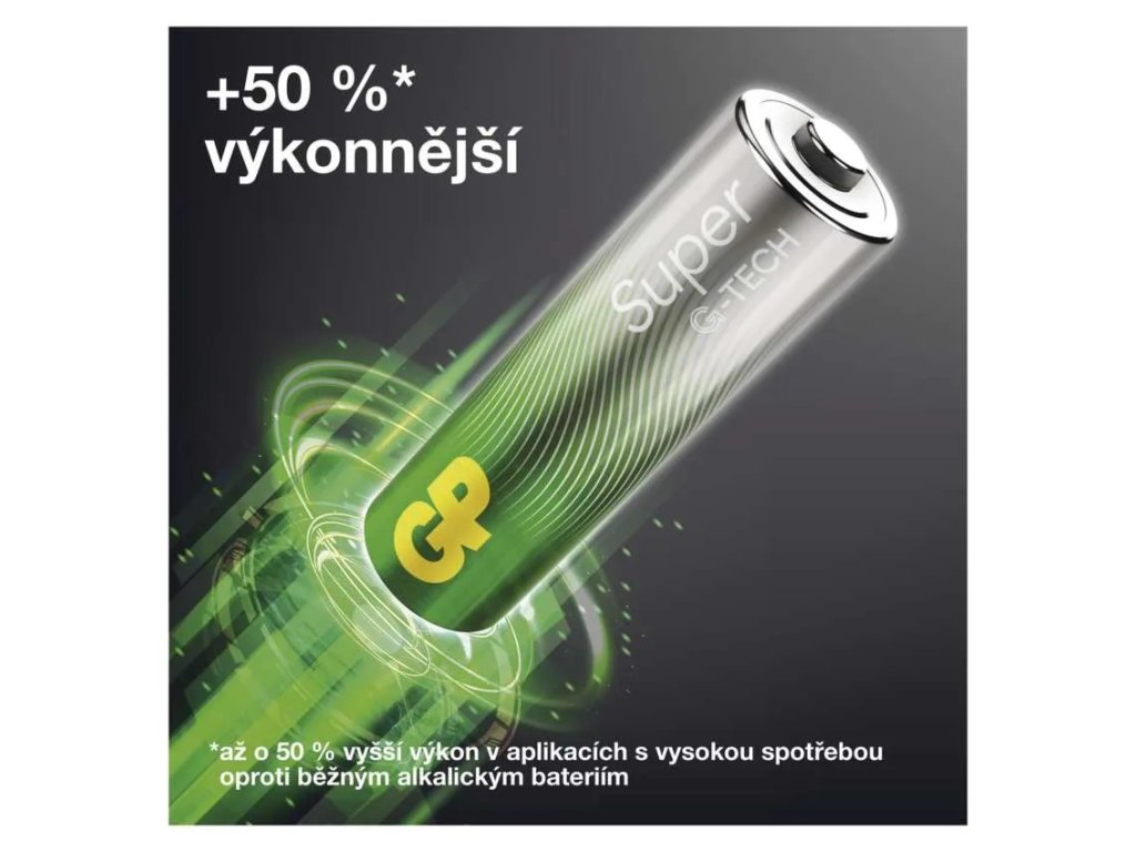 Pokud hledáte baterie, které vám poskytnou spolehlivou a dlouhotrvající energii pro vaše elektronické zařízení, sáhněte po nových alkalických bateriích GP SUPER, které jsou vybaveny revoluční technologií G-TECH s výdrží o 50 % větší oproti běžným alkalickým bateriím.
