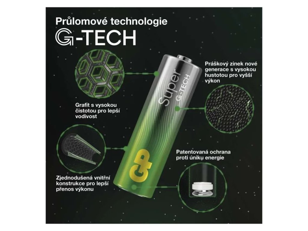 GP SUPER baterie jsou vybaveny nejmodernější technologií G-TECH, která zajišťuje maximální výkon ve vašich zařízeních. Čtyři významné průlomové změny byly implementovány, zaměřující se na zvýšení výdrže energie a zajištění pevnějšího těsnění baterií.