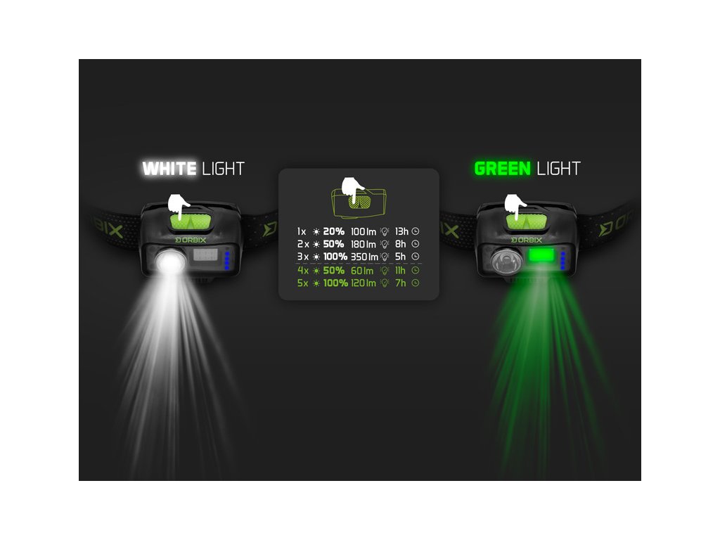 Na čelovce se nacházejí dvě LED diody, které nabízejí možnost bílého nebo zeleného světla. Při prvním stisku spínacího tlačítka se rozsvítí bílé světlo o intenzitě 20 % (100lm), přičemž baterie vydrží 13h. Opakovaným stisknutím se aktivuje režim 50 % s výdrží 8 hodin, a třetím stisknutím se rozsvítí bílé světlo na 100 %, přičemž baterie vydrží 5 hodin.