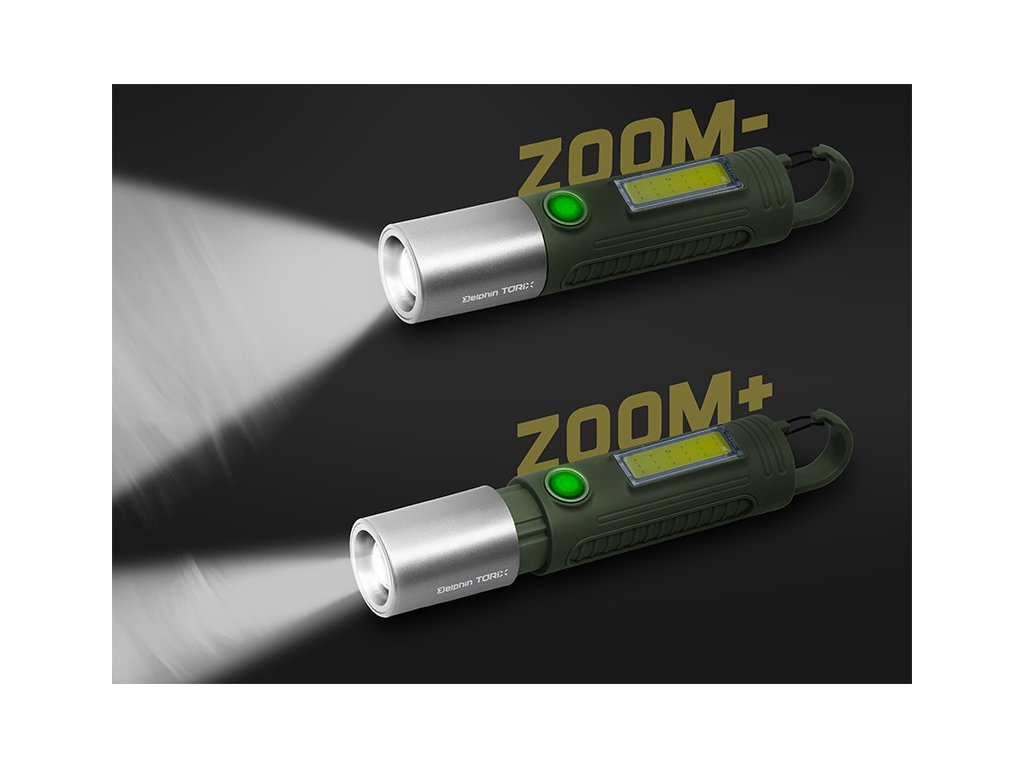 Mezi největší přednosti svítidla Delphin Torix patří právě funkce ZOOM. Pomocí výsuvné části můžete snadno přiblížit nebo oddálit čočku, čímž upravíte šířku světelného kužele – od širokého rozptýleného svitu až po úzký koncentrovaný paprsek, ideální například pro noční nahazování.