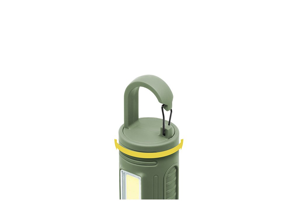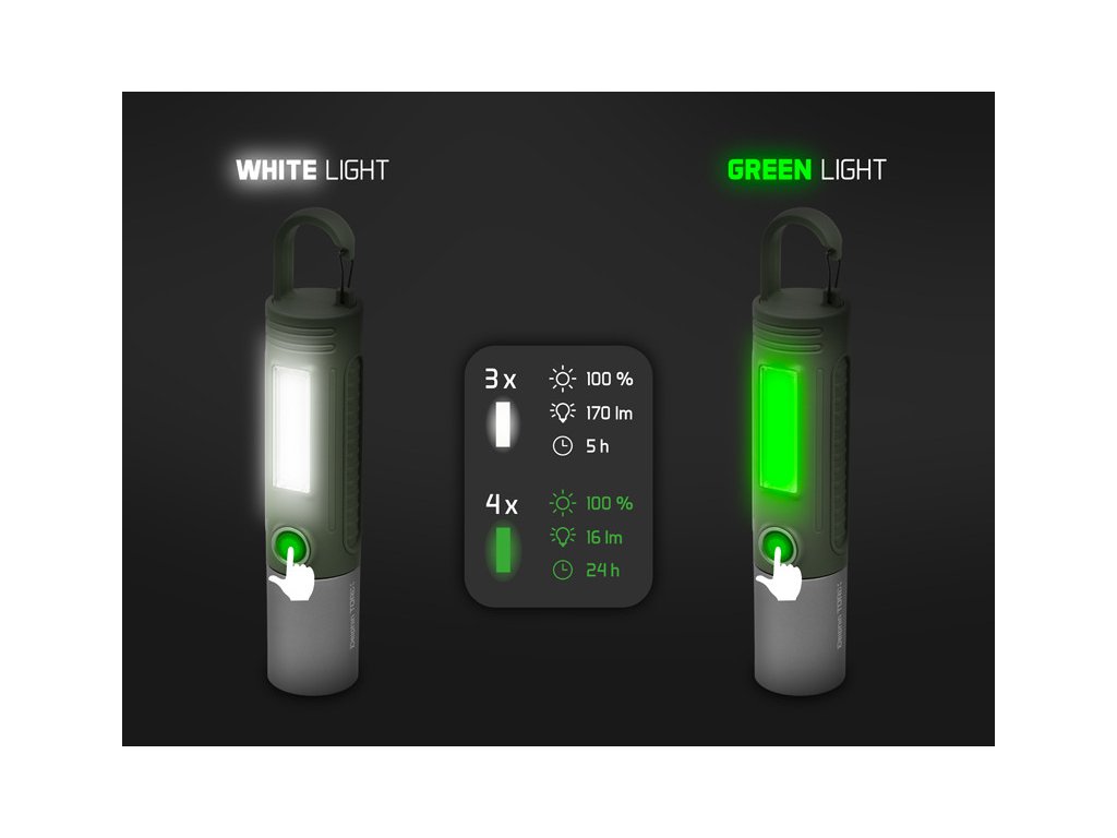Prvním stisknutím se aktivuje hlavní dioda s funkcí ZOOM a 100% intenzitou svícení (140 lumenů), přičemž výdrž baterie v tomto režimu je přibližně 5 hodin. Druhý stisk sníží intenzitu světla na 50 % (70 lumenů). Třetím kliknutím se zapne druhá dioda s bílým světlem a plnou intenzitou 170 lumenů, ve které svítilna vydrží fungovat přibližně 5 hodin. Čtvrtým stisknutím se aktivuje zelené světlo, ideální například jako poziční osvětlení – jeho výdrž dosahuje až 24 hodin.