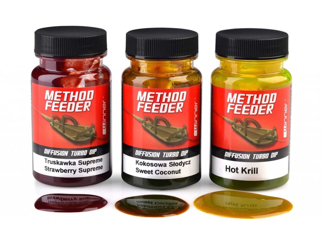 Metod Feeder Diffusion Turbo Dip - je dokonalý, univerzální atraktor plný aromat, extraktů a dodatků. Kromě základních živin také obsahuje ve vodě viditelné barvivo, které vytváří fluorescenční oblak jež se uvolňuje kolem návnady a účinně tak láká ryby. Díky speciální konzistenci vnadí Doffision Turbo Dip dlouhodobě. Je to silná zbraň, neocenitelná v tichých místech a mezi vegetací. balení-50ml příchutě: vanilka, ostružina, moruše, kokos, jablko