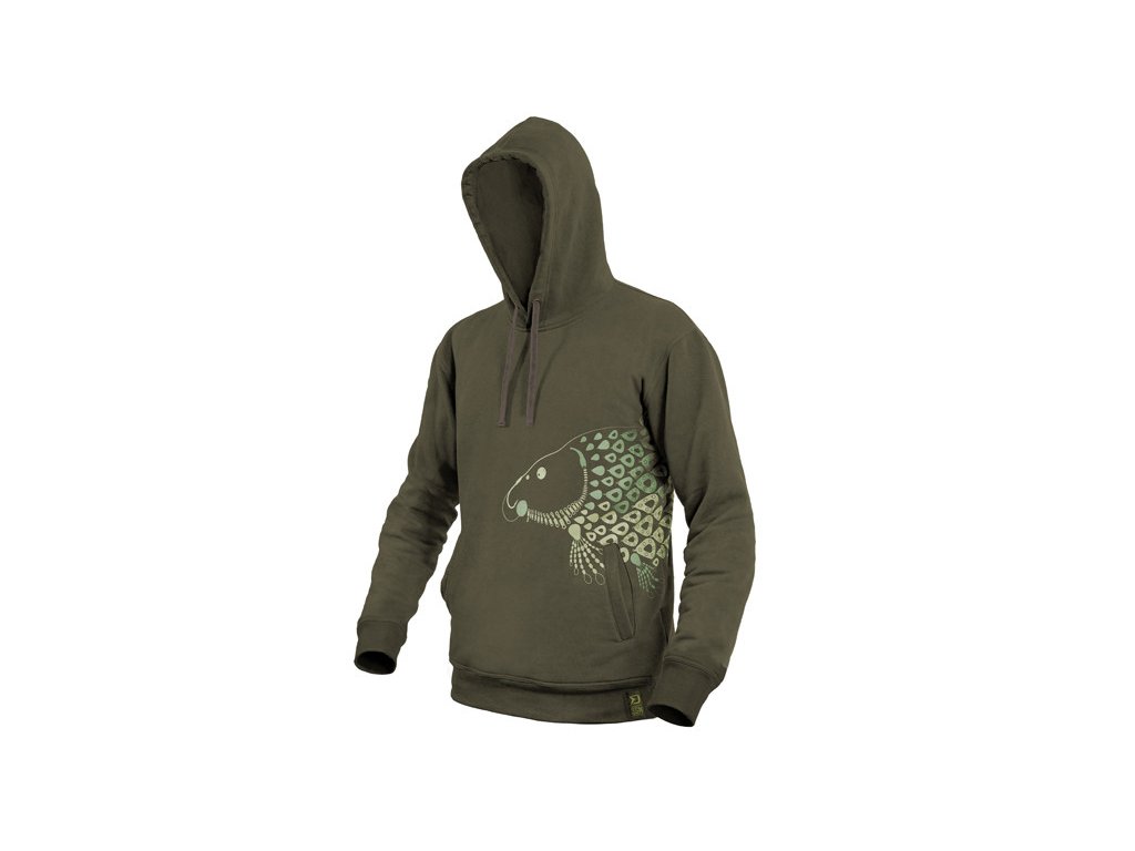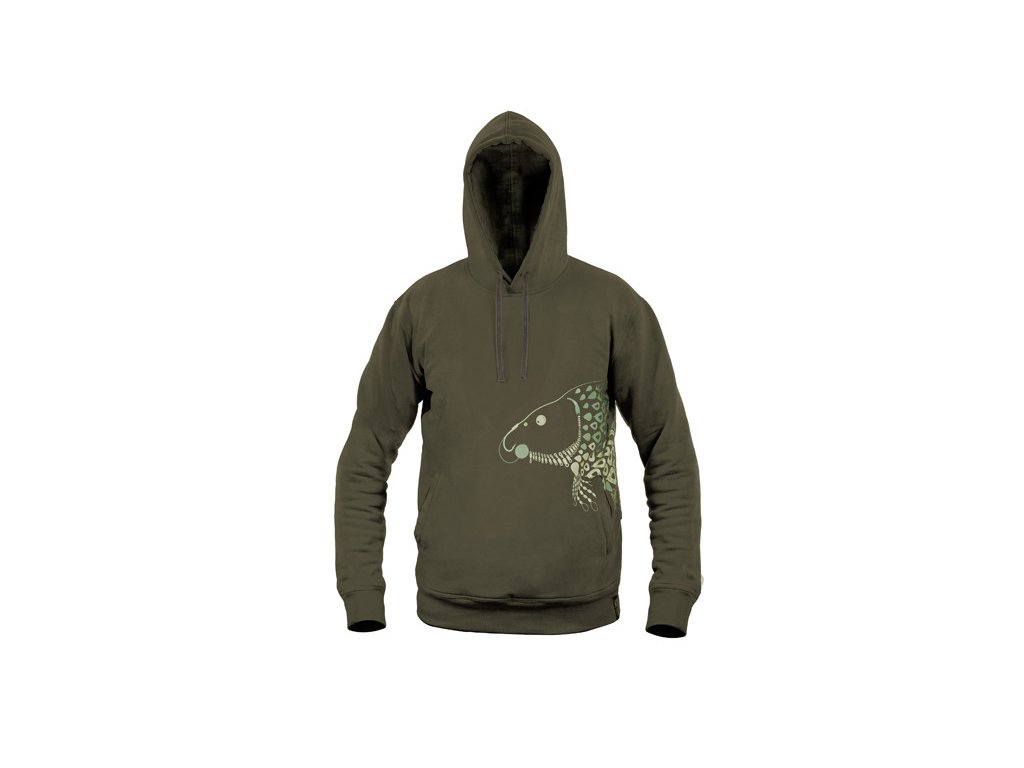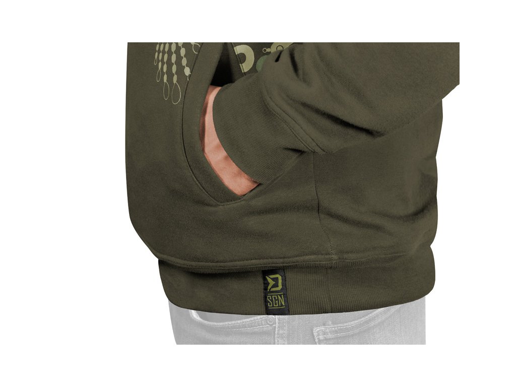 Delphin TACKLE Kapr je extra pohodlná, stylová mikina s kapucí, v níž se budete cítit maximálně komfortně nejen na rybách, ale i během běžného nošení. Je vyrobena z materiálu tmavě zelené barvy, čímž dokonale zapadne do přírodního prostředí. Motiv kapra vyobrazený na mikině je kompletně tvořen z jednotlivých prvků kaprařských montáží jako jsou obratlíky, olůvka, návazec a podobně. Tím se stává Delphin TACKLE rozpoznatelným a opravdu jedinečným kouskem mezi kaprařským oblečením. V přední části disponuje dvěma kapsami, které umožňují ohřátí rukou v chladném počasí, ale také uschování a přenos různých věcí. Samotná mikina je vyhotovena z příjemného hřejivého materiálu vysoké kvality s precizním zpracováním detailů. Díky škále velikostí S až KING SIZE si vybere tu správnou opravdu každý. Složení: 60% polyester, 40% bavlna velikosti-S, M, L, XL, XXL, XXXL