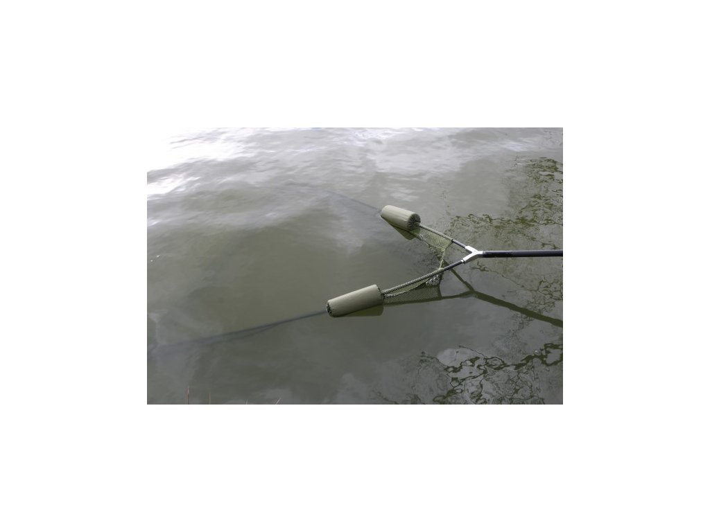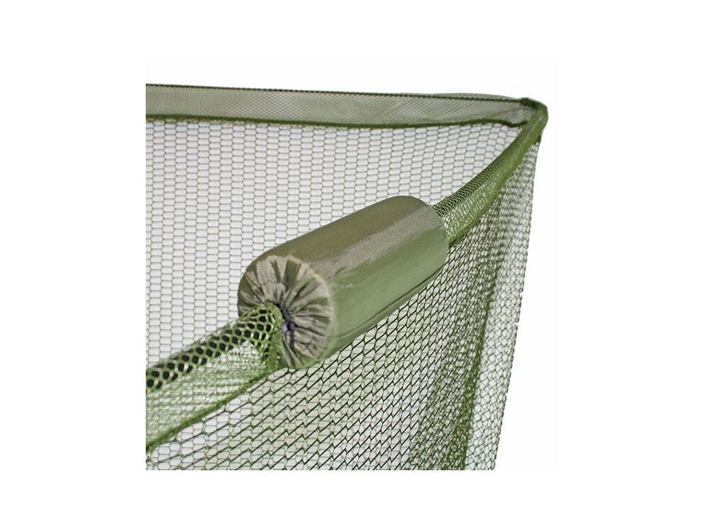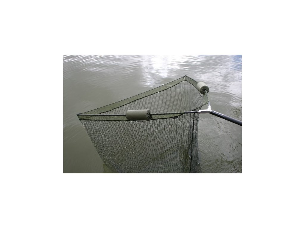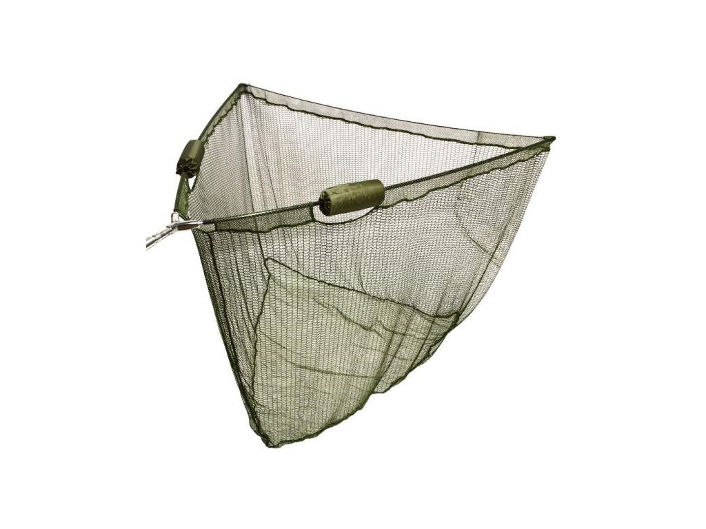 Hlava, která šetří ruce i ryby. Dva integrované plováky na každém rameni drží síť přirozeně na hladině, takže se můžete soustředit na navedení ryby místo zápasu s potápějící se hlavou. Jemná zelená síťovina je k rybě šetrná: boční panely mají větší oka pro rychlý odtok vody a menší odpor, dno a lem jsou z jemnějšího materiálu, který chrání sliz a ploutve i při delším podebrání u břehu či v podběrákové kolébce. Konstrukčně jistí vše kovový kříž (spreader block), který přesně drží ramena v optimálním úhlu. Kombinace rozměru 42", délky ramen 105 cm a hloubky 90 cm pokrývá drtivou většinu kaprařských situací od volné vody po těžké porosty. Celé řešení je patentované (4037345) a v praxi přináší klid při nočních podebíracích manévrech, v proudu i ve větru.