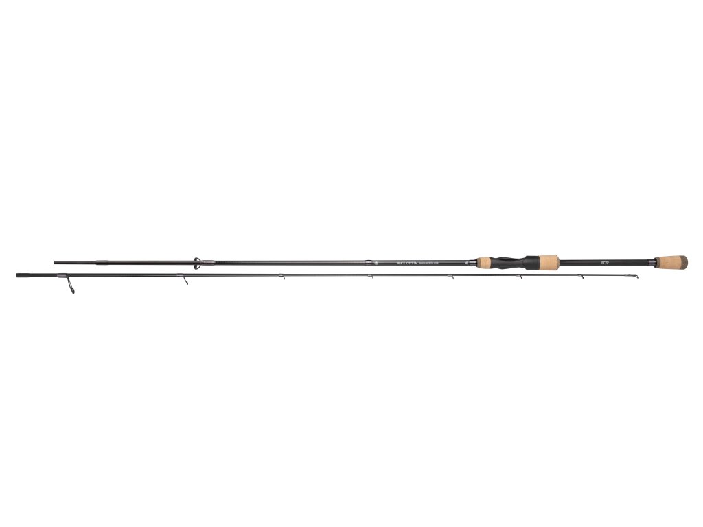 Black Crystal Spin M je prut, který spojuje citlivost špičky s rychlým, komunikativním blankem, takže přesně víte, co nástraha dělá – od drobných „ťuků“ candátů až po kontakt s kamenem. Komponenty FUJI zajišťují hladký průchod šňůry i dlouhodobou spolehlivost, silná rukojeť drží jistotu při záseku a dává páku při zdolávání. V reálu to znamená čisté vedení gum po zlomech, přesné twitchování woblerů a stabilní práci třpytek bez zbytečných vibrací do ruky. Akce M je vyvážená: pružná na práci s nástrahou, ale s rezervou na tvrdý zásek a diktování směru rybě.