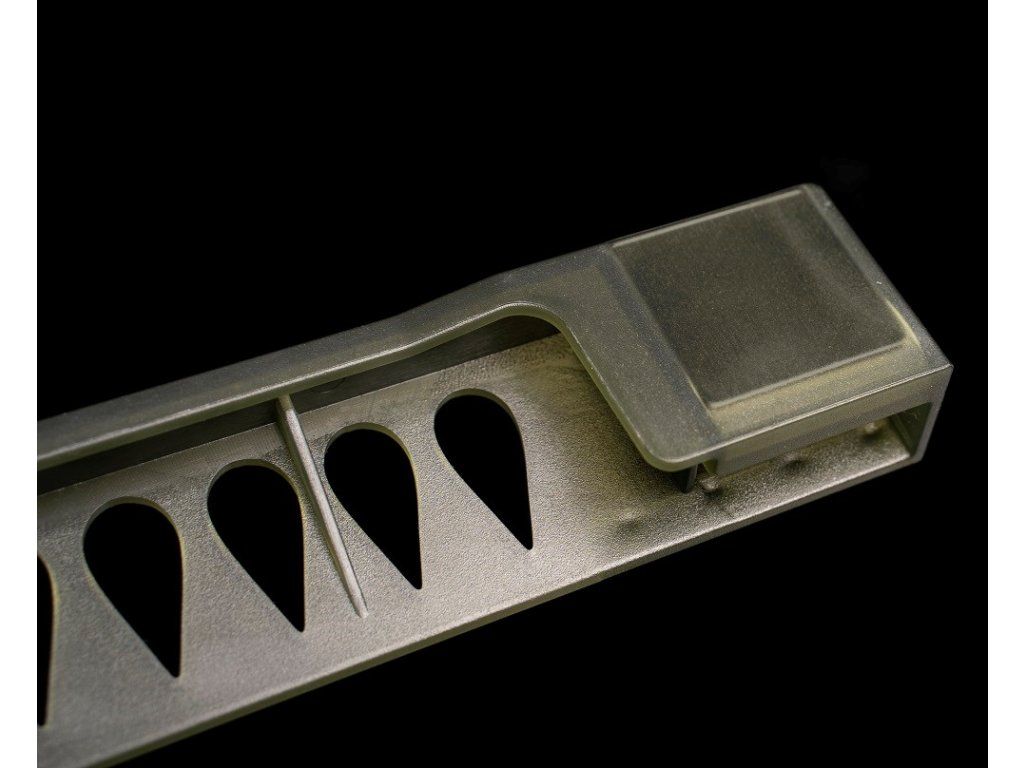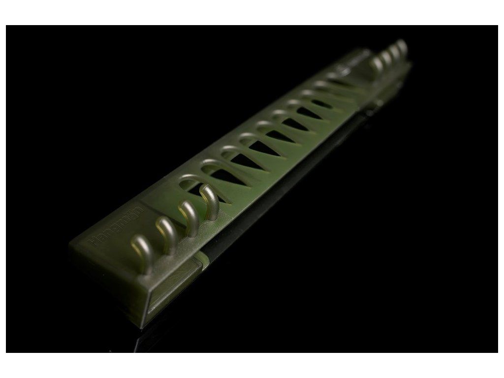 Použití je úplná brnkačka — vezmeš držák, přiložíš ho na kovovou plochu a on se přichytí. Díky tomu ho můžeš rychle přesouvat podle potřeby: na rám stanu, do bivaku nebo na boční panel auta. Na háčky věšíš hotové návazce a do otvorů zasunuješ další připravené montáže. Když se blíží akce, přesun ho k prutům a máš vše po ruce. Když lov usíná, vrátíš ho zpátky na stěnu bivaku nebo do auta — jednoduše, rychle a bez šroubování.