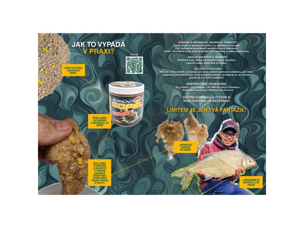 Použití Šonova Soplu je jednoduché a přitom efektivní. Smíchejte 50 g směsi s 10 g Soplu, případně více, pokud chcete dosáhnout ještě intenzivnějších výsledků. Přidejte 150–200 ml vody nebo boosteru a nechte směs chvíli odstát, aby se všechny složky dokonale propojily. Výsledná gelovitá struktura nejenže skvěle drží na háčku, ale také se přirozeně pohybuje ve vodě, což ryby láká a podněcuje k útoku.