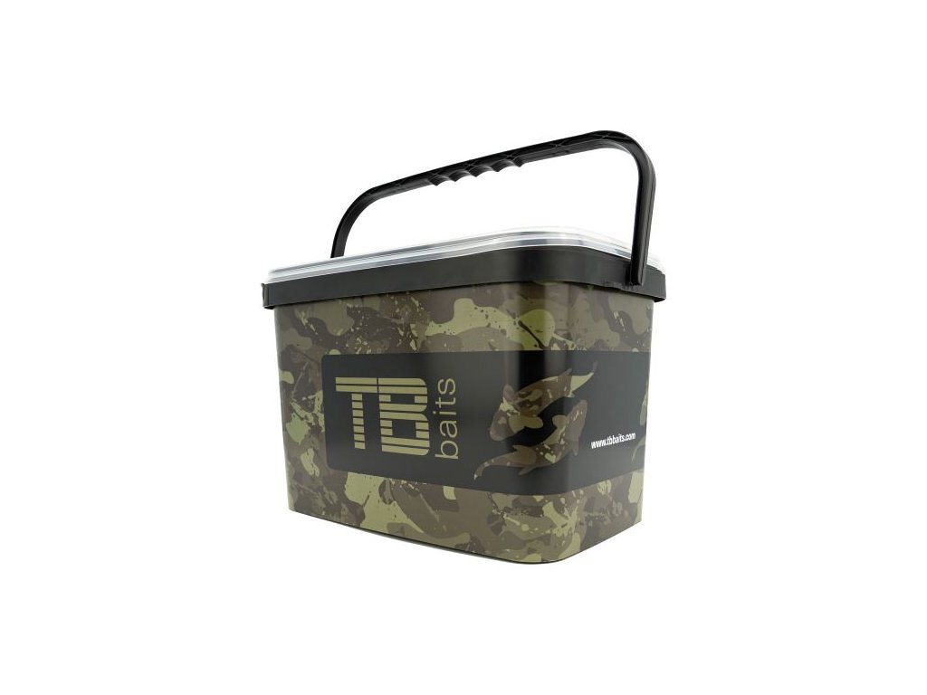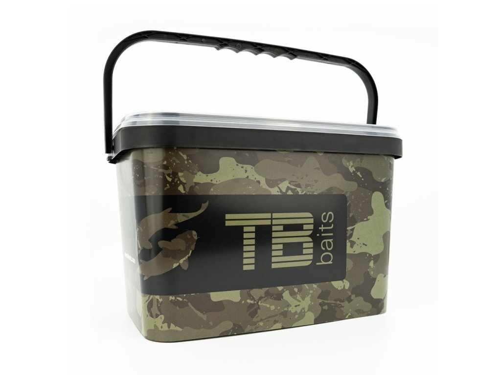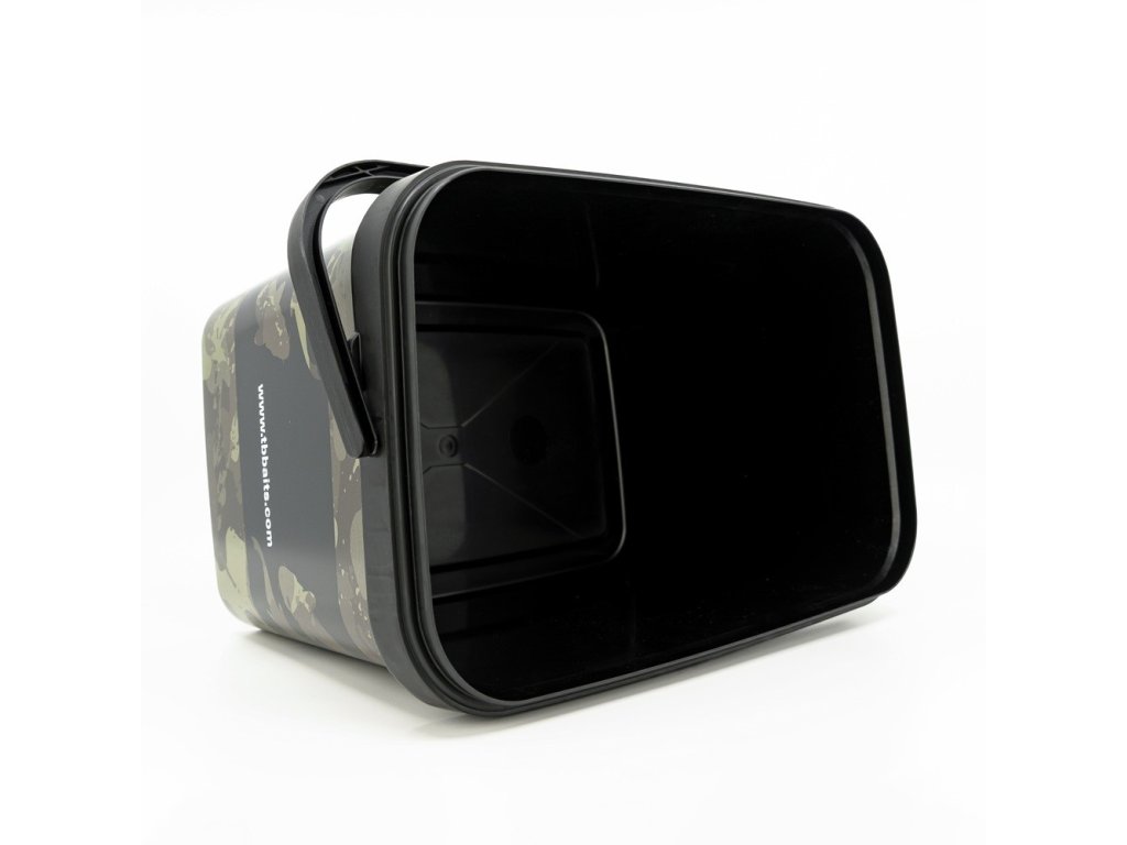 Plastový kbelík obdélníkového tvaru v designu Camo Carps od značky TB Baits.