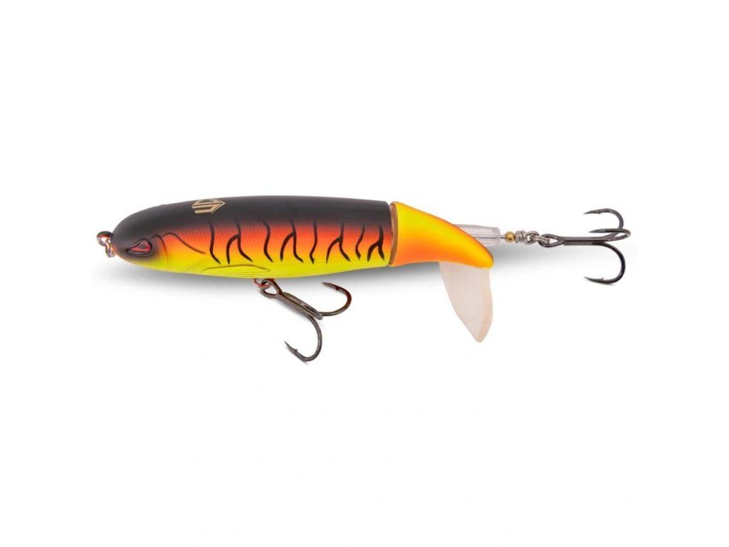 Jestli chceš z wobleru dostat maximum, zkoušej různé tempo vedení. Někdy funguje svižnější tah, jindy pomalejší dráždivé vedení po hladině, kdy wobler dělá silnou stopu a sumec má čas si ho najít. Díky tomu, že má pracovní hloubku 0,00 m, jede čistě nahoře a je ideální právě na hladinové ataky.