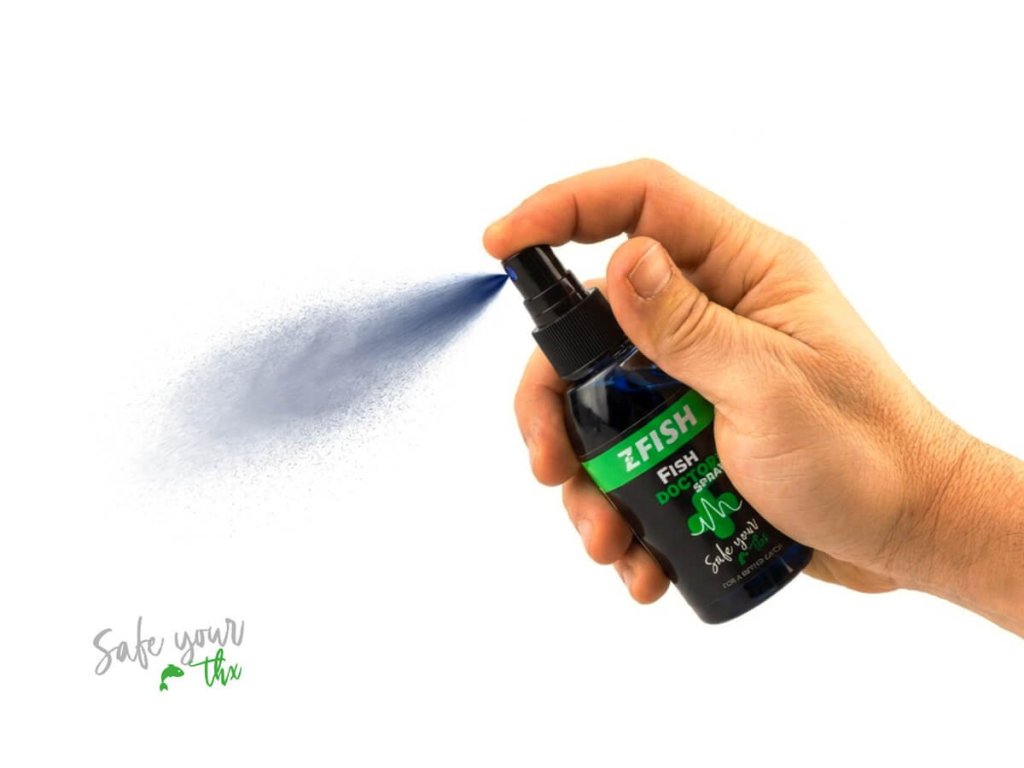 - Po bezpečném vyháčkování ryby a základní kontrole poranění aplikujte sprej přímo na ránu krátkými střiky; ošetřete celý povrch poranění.