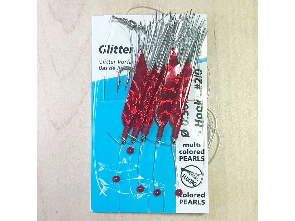 Velmi silný dráždivý páternoster s muškami s glittery rybí kůží a fosforeskujícím korálkem který každého mořského dravce probere z letargie.